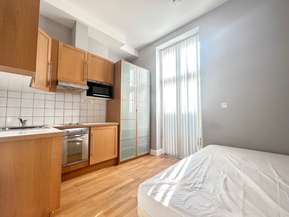 シェパーズ・ブッシュ・マーケットの中心部に位置する、家具付きで天井が高いスタジオフラット、家賃に全ての水道光熱費とWi-Fiインターネットが含まれています